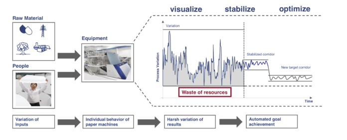 Figure 1 shows the basic concept of all Voith Papermaking 4.0 solutions, whose main goal is to optimize the production process with a marked reduction of raw material and energy waste.
